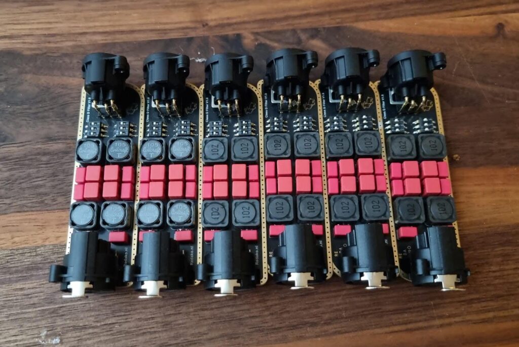 I was a bit worried about the filter adding distortion initially, as the shielded inductors aren’t technically linear, but could barely detect a change in THD inserting it into a loopback test from my audio interface. It added some second order harmonics, compared to the loopback without the filter – 0.0011% summed together – but that’s still orders of magnitude less than the audible threshold. When I get my hands on a good clean amplifier I’ll test with higher voltages, see how it holds up there.